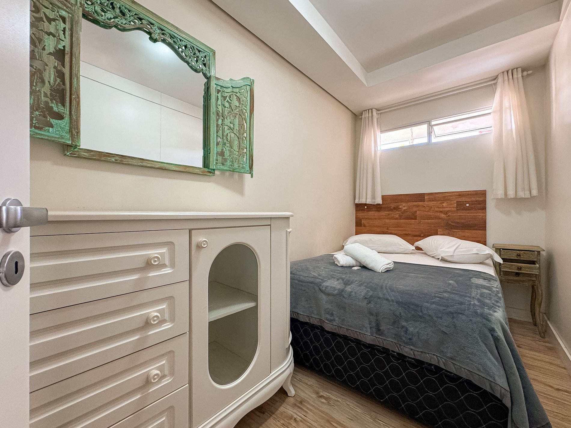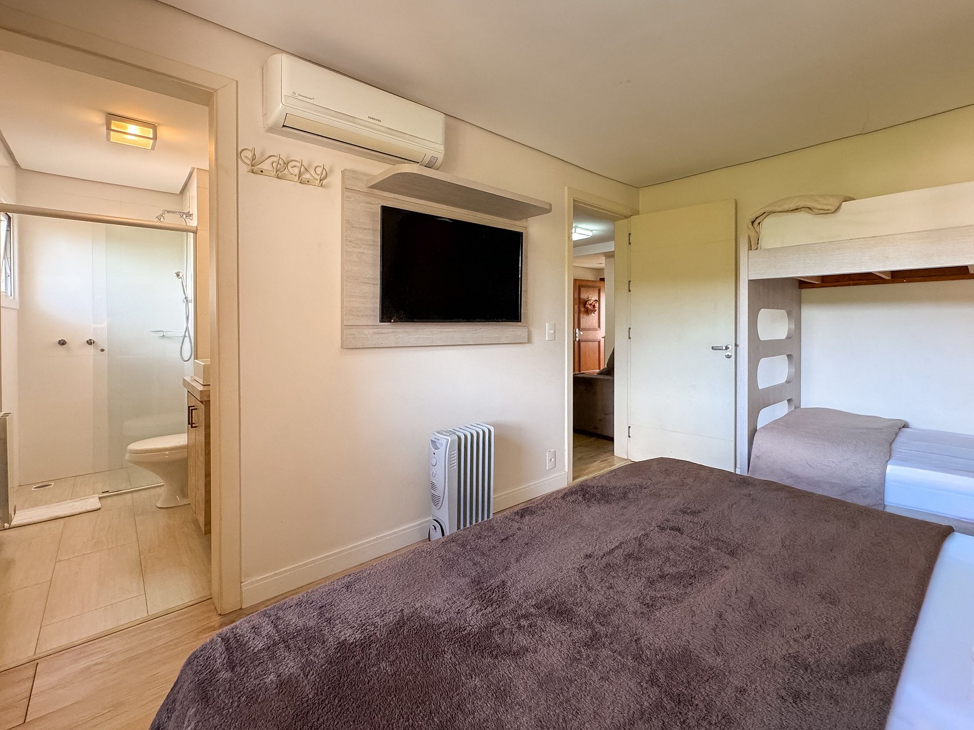 A suíte com beliche torna o espaço ideal para famílias com crianças, enquanto o segundo quarto garante privacidade para outro casal.